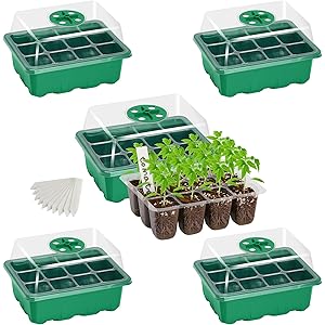 Bonviee 5-Pack Seed Starter Trays, Seed Starter Kit with Adjustable Humidity Dome and Base Indoor Greenhouse Mini Propagator for Seeds Growing Starting (12 Cells Per Tray, Green)
