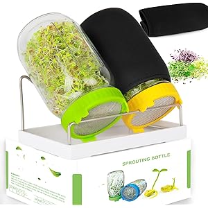 Seed Sprouting Kit, 2 Large Wide Mouth Mason Jars with Sprout Lids, Blackout Sleeves, Drain Tray, Stainless Steel Stand, Sprouts Growing Kit for Bean, Broccoli, Alfalfa (Yellow+Green)